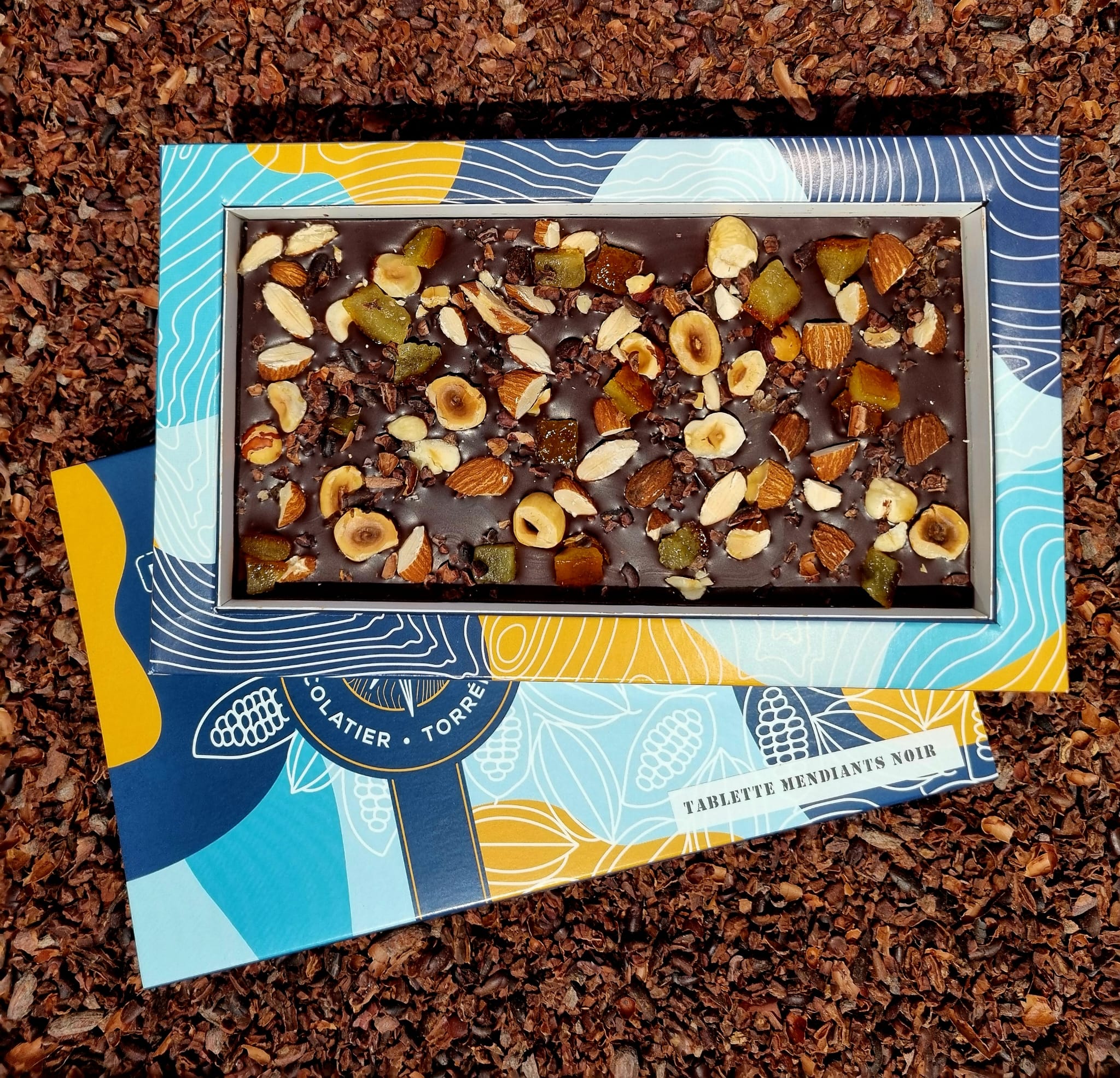 La tablettes mendiant noir 65%, en version xxl pour encore plus de plaisir. Découvrez notre chocolat noir d’origine du Vanuatu 65% en accord avec des Amandes, des Noisettes, des éclats de fèves de cacao et des cubes d’oranges confites.
